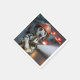 A dalmatian dog confidently holds a water-spraying fire hose, standing in front of a red fire truck.