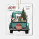 En tårblått pickup lastbil bär ett dekorerat Helgdag träd och presentat paket på denna söta julprydnad av glas. Tittar ut från skaften är en vacker Dalmatisk hund. En rustik träskylt på stötfångaren säger "Julturen". Den röda och grönt stiliserade texten längst upp till lämnat står "GOD JUL", med ditt namn (eller hund) och året vid högerna. Båda sidor har samma bild.