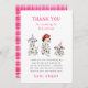 Söt brandman tema barn födelsedagsfest tackkort med akvarell illustration av dalmatiner hundar med brandman hjälm och rosa fest hattar. Standardtexten tackar gästerna för att de kom till festen och för gåvorna. Texten säger "tack för att du kom till räddningen!"