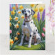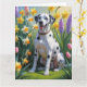 En glad hund sitter fridfullt på frodig grön gräs, omgiven av färggranna vårblommor under en mjuk blå himmel. Denna digitala oljemålning fångar ett lugnt ögonblick med uttrycksfulla penseldrag, varma färger och en känsla av mild glädje.