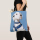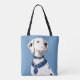 Stiliserad illustration av en Dalmatisk hund som bär ett blått halsband mot en blå bakgrund och som belyser dess tydliga fläckutseende och vänskapliga beteende.