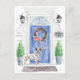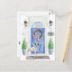 Meddela din ny adress med vår snyggt med ett Dalmatiskt, blått framdörr, välkomstmatta, skiffertecken, toparies och en blommigt krans på en grått-tegelbakgrund.