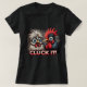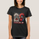 Två färgstarka, karikatyrartade kycklingar med överdrivna egenskaper står mot mörkens bakgrund. Under dem tillför texten "CLUCK IT!" ett humoristiskt drag.