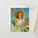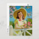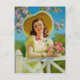 Klassiskt Pinup-kort som visar en vacker Pin-Up-flicka under vårtiden omgiven av blommar och rosa ros, målad av Art Frahm (1907-1981)