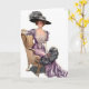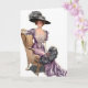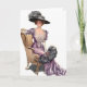 Vintage illustration av en söt ung kvinna sitta på en stol som bär en lång lila klänning och hatt och som håller ett stort fjäderfärdigt fläkt som matchar hatten.