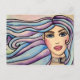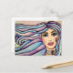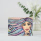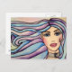 Ett snyggt vykort med illustration av vattenfärgen porträtt på en ung flicka med blå ögon, rosa läppar, ömtåliga och feminina egenskaper, långa hår i blått och violett toner.