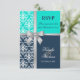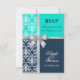 © 2013 Socialite Designs. Elegant svarskort för bröllopsinbjudan för sommar- eller vinterbröllop med vit damask, tryckt kors av silverfärgad band och rosett och två bakgrundsfärger i marinblått och turkos / akvatblått. Kontakta Socialite Designs om du önskar en annan färgkombination, hjälp med anpassning eller andra bröllopsprodukter som skapats med denna design. OBS: BAND- OCH ROSETT-MOTIVET ÄR UTTRYCKT GENOM TRYCK PÅ INBJUDAN.