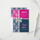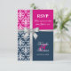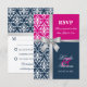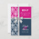 © Socialite Designs. Elegant svarskort för bröllopsinbjudan till en sommarbröllop med vit damask, tryckt kors silverband och rosett, samt två bakgrundsfärger i marinblått och fuchsia. Kontakta Socialite Designs om du vill ha en annan färgkombination, hjälp med anpassning eller andra bröllopsprodukter som skapats med denna design. OBS: BANDEROLLEN ÄR EN BILD OCH ÄR UTRYCKT PÅ INBJUDAN.