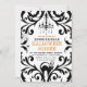 Denna fantasifulla design har en svart ornamental damaskus-stil ram med en spöklik katt, fladdermöss och en kuslig spindel. En ljuskrona hänger från toppen och sätter stämningen för denna eleganta partininbjudan. Baksidan har ett koordinerande svart damaskusmönster som är prytt med fladdermöss.