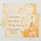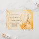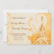 Virvlar böljar och rullar runt omkring ett bränt sienna handritat Eiffeltorn mot praktfull, blomsterlik gul och orange damast, accentuerat med svaga nyanser av ett stiliserat maskrosmönster. En fransk kärleksdikt är svagt ingraverad i den krämfärgade bakgrunden och ger den perfekta följeslagaren till den anpassningsbara bröllopsinbjudan texten i typsnitt med skrivstil och gravyr, också i bränt sienna.
