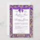 Lila och guld elegant damaskmönster bröllopsinbjudan med tryckt bow design och modern typografi text.