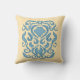 Damaskrobiner äggblått gammalt krämkudde, designade av Kristie Hubler, har en gammal dammliknande design i stil, upprepade mönster på framsidan, en på baksidan, med akva, tealblått grafiskt fuktmotiv och gräddaktig gult persilja guld bakgrund.