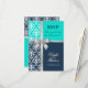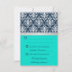 © 2013 Socialite Designs. Elegant svarskort för bröllopsinbjudan för sommar- eller vinterbröllop med vit damask, tryckt silverfärgad slinga och rosett samt två bakgrundsfärger i marinblått och turkos / akva. Kontakta Socialite Designs om du önskar en annan färgställning, hjälp med anpassning eller andra bröllopsprodukter med denna design. OBS: SLINGAN ÄR EN BILD OCH ÄR UTRYCKT PÅ INBJUDAN.