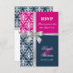 © 2013 Socialite Designs. Elegant svarskort för bröllopsinbjudan för ett sommarbröllop med vit damask, ett tryckt silverfärgat band och rosett samt två bakgrundsfärger i marinblått och fuchsia. Vänligen kontakta Socialite Designs om du önskar en annan färgkombination, hjälp med anpassning eller andra bröllopsprodukter som skapats med denna design. OBS: BAND OCH ROSSETT ÄR EN BILD OCH ÄR UTRYCKT PÅ INBJUDAN.