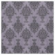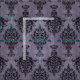 Linda Baysinger hack hand plockade, gotisk svart damastast design, på purpurfärgad fauxstenstruktur.