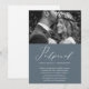 Elegant ändring av datum för bröllopsförsenings kungörelse. Detta enkla kungörelse är ett chic sätt att låta inbjudna gäster veta att datumet för ert bröllop har ändrats på grund av oförutsedda omständigheter, och innehåller det nya bröllopsdatumet. Detta trendiga kungörelse har vacker "försenad" vit kalligrafiskrift på en rökblå bakgrund med parets foto, och en vit baksida på kortet.