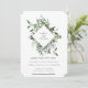 Elegant vattenfärg botanisk diamantformad ram, bröllopsinbjudan. Ömtåliga och luftiga salviagröna botaniska blad och grenar med mjuka vita blommor. Baksidan av kortet har en solid dammig salviagrön färg.