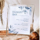 Denna dammiga blå akvarellblommiga efterrätssmiddagsmeny skylt är perfekt för ett romantiskt, utomhusbröllop eller en chic, modern fest.