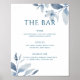 Denna dammblå akvarellblommiga menytafel för bröllopsbaren är perfekt för ett romantiskt utomhusbröllop eller en chic, modern fest.
