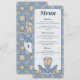 Förhöj din mottagning med denna eleganta jugendstilinspirerade meny för bröllop. Med ett sofistikerat dammigt blått blomster motiv och en tidlös geometrisk kant, organiserar detta vertikala kort perfekt din frukost eller middag under bröllopet. Den rena layouten och det vintage-inspirerade estetiken passar trädgårds-, botaniska eller klassiska bröllopsteman vackert.
