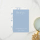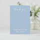 Eleganta och hjärtliga, dessa platta tack-kort är den perfekta avslutande detaljen efter er bröllopsfest. Framsidan har en mjuk, dammig blå bakgrund med chic, vit, skrivstilstext och står "tack" i ett flytande kalligrafiteckensnitt, kompletterat med den klassiska serif-texten "Från den blivande fru Svensson" — anpassad med ert kommande efternamn.