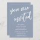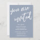 Denna svits utmärkande beror på det moderna, handskrivna typsnittet som används för accentfraser. I detta stycke användes det handskrivna teckensnittet för att skapa en grafisk representation av orden "du är inbjuden". Använd mallfälten för att lägga till dina personliga uppgifter och gör denna unika, moderna design till din egen. Den dammiga blå bakgrunden kan ändras till valfri färg du föredrar. Vänligen kontakta oss med eventuella specialförfrågningar eller för anpassningshjälp. // 100 //