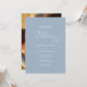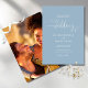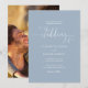 Denna eleganta bröllopsinbjudan kan anpassas med dina festdetaljer i chic typografi på en dammblå bakgrund och ditt speciella foto på baksidan. Designad av Thisisnotme