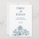 Skapa ett tidlöst första intryck med denna eleganta dammiga blå blomsterbröllopsinbjudan. Designad för moderna romantiska bröllop, kombinerar denna layout förfinad typografi med mjuka botaniska element för en ren, lyxig känsla.