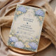En romantisk bröllopsdesign med frodiga dammblå hortensior i par med mjuka elfenbensfärgade rosor och ömtåliga ängsblommor. Blommorna ramar in layouten i en graciös, symmetrisk trädgårdskomposition med accentuerad subtil klassisk detaljering. Mot en varm pergamentbakgrund känns paletten raffinerad, tidlös och otvungen elegant. Perfekt för en sofistikerad fest med en mjuk blå botanisk estetik.
