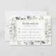 Designen har en elegant tryckt guldfärgad geometrisk ram på framsidan med eukalyptus och blommande gröna blad i nyanser av grönt, dammblått, grått och mer. Baksidan har en dammblå-grå nyans vattenfärgsvätt texturerad bakgrund med ett matchande blad-gren-element.