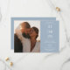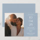 Ett modernt minimalistiskt kort för att spara datumet med ditt speciella datum, foto och bröllopsdetaljer i klassisk, chic typografi på en dammblå bakgrund. Designad av Thisisnotme