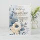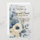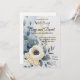 Ett raffinerat bröllopsinbjudande med en minimalistisk bohemisk design med mjuka akvarellackcenter i dammblått, krämvitt och blekgult. I mitten omges en delikat krämvit blomma av luftiga eukalyptusblad och gyllene vildblomsterkvistar. Den rena vita bakgrunden och subtila penseldragstexturer skapar en elegant, modern estetik, perfekt för par som söker en tidlös men avspänd bröllopsstil. Dammblått