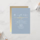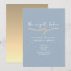Elegant "natten före" bröllopsrepetitionsinbjudan i mjuk dammblå med ett romantiskt guldlina hjärta. Perfekt för ett modernt, minimalistiskt förbröllopsfirande. Helt anpassningsbar med namn, datum och detaljer.