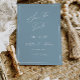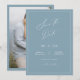 Ett minimalistiskt kort för att spara datum med modern kalligrafi i en dammblå nyans för det perfekta sättet att tillkännage din bröllop.