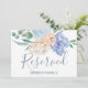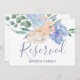 Denna dammiga blå blommiga bröllops "reserverad" skylt är perfekt för ett vår- eller sommarmässigt bröllop. Kortet är dubbelsidigt (trycks på båda sidor). Den utsökta designen har ljusblå peonior arrangerade med persika- och krämfärgade blommor i en vacker bukett. Använd dessa kort för att reservera stolar eller bord vid er bröllopsceremoni, mottagning eller någon annan tillställning.