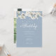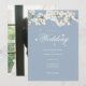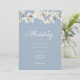 Dammblå blomvit blomning bröllopsinbjudan med ömt vårblomning runt dina bröllopsdetaljer i elegant vit text på en dammig blå bakgrund. Anpassa med din speciella evenemangsinfo. Baksidan visar ditt eget speciella foto. Designad av Thisisnotme