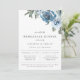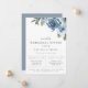 Vattenfärg blomsterarrangemang i nyanser av dammig blå och grön, bröllopsinbjudan. Chic och modern typsnittsdesign. Baksidan av kortet har en enfärgad dammig blå färg.