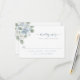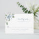 Dammig Blå Bröllop RSVP-kort. Elegant och romantisk, den dammiga blå blomsterbröllopsserien har vacker handmålad akvarell dammig blå, krämrosa rosor och salvia gröna blad arrangerade som en stilren bukett. Hitta matchande föremål i Dammig Blå Bröllopskrans-serien.