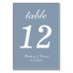 Ett enkelt bröllopsbordnummer för ett dammigblått bröllopstema. Det är bara vit text på en dammigblå bakgrund. Allt förutom själva numret är skrivet med en elegant kalligrafisk skrift.