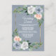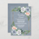 Dammig blå guld rosa persika bröllopskort - designen har en akvarell dammig blå bakgrund med en guldram dekorerad med eukalyptus och grönska med blomsterdekorationer i grått/vitt, dammig blå och rosa/persika.