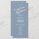 Praktfull vit skrifttypografi på en dammig blå bakgrund gör dessa eleganta moderna bröllopsprogram till något extra. Design av Elke Clarke © Anpassa med din bakgrundsfärg och all din personliga information till ett lyxigt bröllopsprogram som dina bröllopsvärdar kan dela ut när dina gäster går in i kyrkan eller sätter sig där ceremonin kommer att äga rum. Det hjälper människor att följa med under ceremonin, men fungerar också som ett minne för dina gäster. Du kan använda mallfälten för att fylla i den föreslagna informationen om ditt brölloppsfest och ordning för ceremonin och tackmeddelande eller välja "anpassa den" och använda redigeringsmenyn för att ändra textavstånd, teckensnitt, färger som du önskar för att skapa dina egna bröllopsprogram.