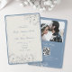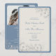 Fira tidlös romantik med denna dammiga blå och elfenbensvita bröllopsinbjudan, designad för par som älskar tradition med en modern touch. Med delikat silverblommig linjekonst, en elegant kombination av seriff- och scripttypsnitt och en subtil vintagekant, förenar denna inbjudan klassisk elegans med rustik-chic charm. Baksidan innehåller ett anpassat foto och en QR-kod för RSVP för sömlöst gästsvar. Perfekt för vår-, sommar- eller höstbröllop, erbjuder denna design ett stilrent och hjärtligt sätt att inbjuda nära och kära till din speciella dag.