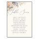 Dammig blå och krämfärgad blommig bröllopstavla 'sju' kort med elegant handskrift och en textmall för gästernas namn.