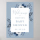 Denna eleganta dammiga blå lantliga blomsterbukett för baby shower-välkomstskylt kan anpassas med din information i modern typografi. Designad av Thisisnotme©