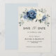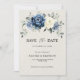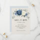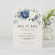 Dammig blå blomsterbröllop spara datum-kort med elegant bukett av marinblå, kunglig blå, vit, guld, champagnej elfenben, rosafärgad ros, ranunculus blomknoppar och salvia gröna eucalyptusblad och elegant akvarellbukett. Vänligen kontakta mig för hjälp med anpassning eller om du behöver någon annan produkt med denna design.