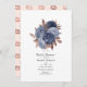 Elegant roséguld, marinblå och dammig blå blomsterbröllopsinbjudan med inslag av rosablommig rosa som kan anpassas till ditt evenemang.