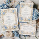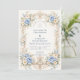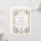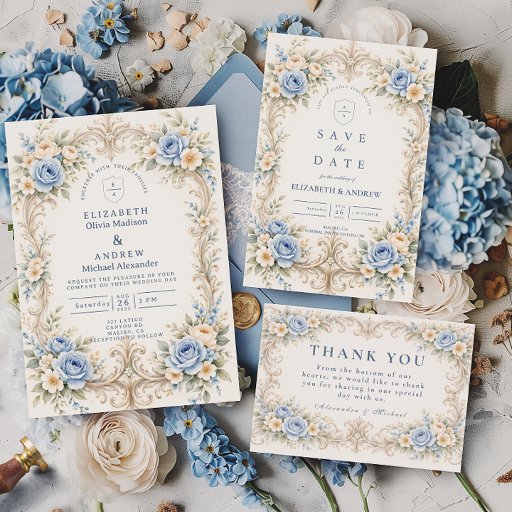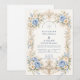 En förfinad barockkomposition prydd med mjuka dammiga blå rosor, krämiga elfenbensblommor och dämpad salvia grönska. Skulpturerad champagne-guld scrollwork ramar in layouten i en elegant, symmetrisk silhuett inspirerad av klassisk europeisk design. De svala blå tonerna i kombination med varmt elfenben skapar en vacker balanserad, romantisk estetik. Perfekt för par som dras till tidlösa blommor, subtil färg och förhöjd vintage charm.