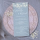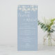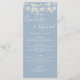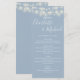 Elegant dammig blå bröllopsmeny med vackra strängljus och signaturstilsnamn. Denna moderna meny kan anpassas med din information i chic vit bokstavsstil. Designad av Thisisnotme©