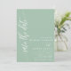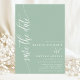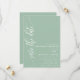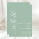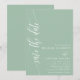 Detta dammiga mintfärgade "spara datumet"-kort har en modern typsnittsstil som ger en touch av tidlös elegans. Den minimalistiska designen håller fokus på era namn och bröllopsdatum, vilket gör ett tydligt och stilrent intryck.