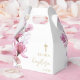 Denna eleganta dammiga rosa genomskinliga blommiga dopfavorlåda kan anpassas med din information i chic typografi. Designad av Thisisnotme©